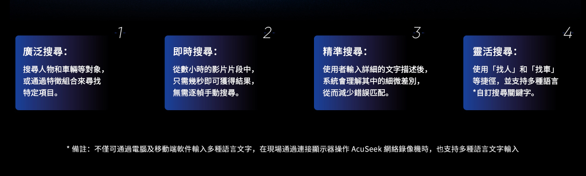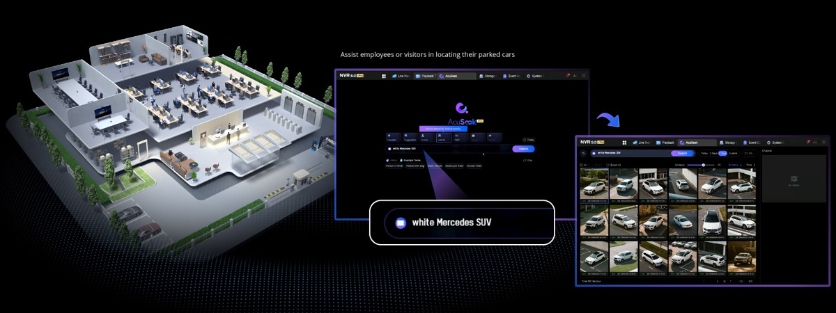 AcuSeek 網絡錄像機基於大型人工智能(AI)模型,支持通過文字進行錄像搜尋,使用者可快速找到包含特定物體的影像。通過理解並關聯視覺內容與自然語言,AcuSeek 既能實現人類的理解能力,又具備機器級的精準度與速度。
